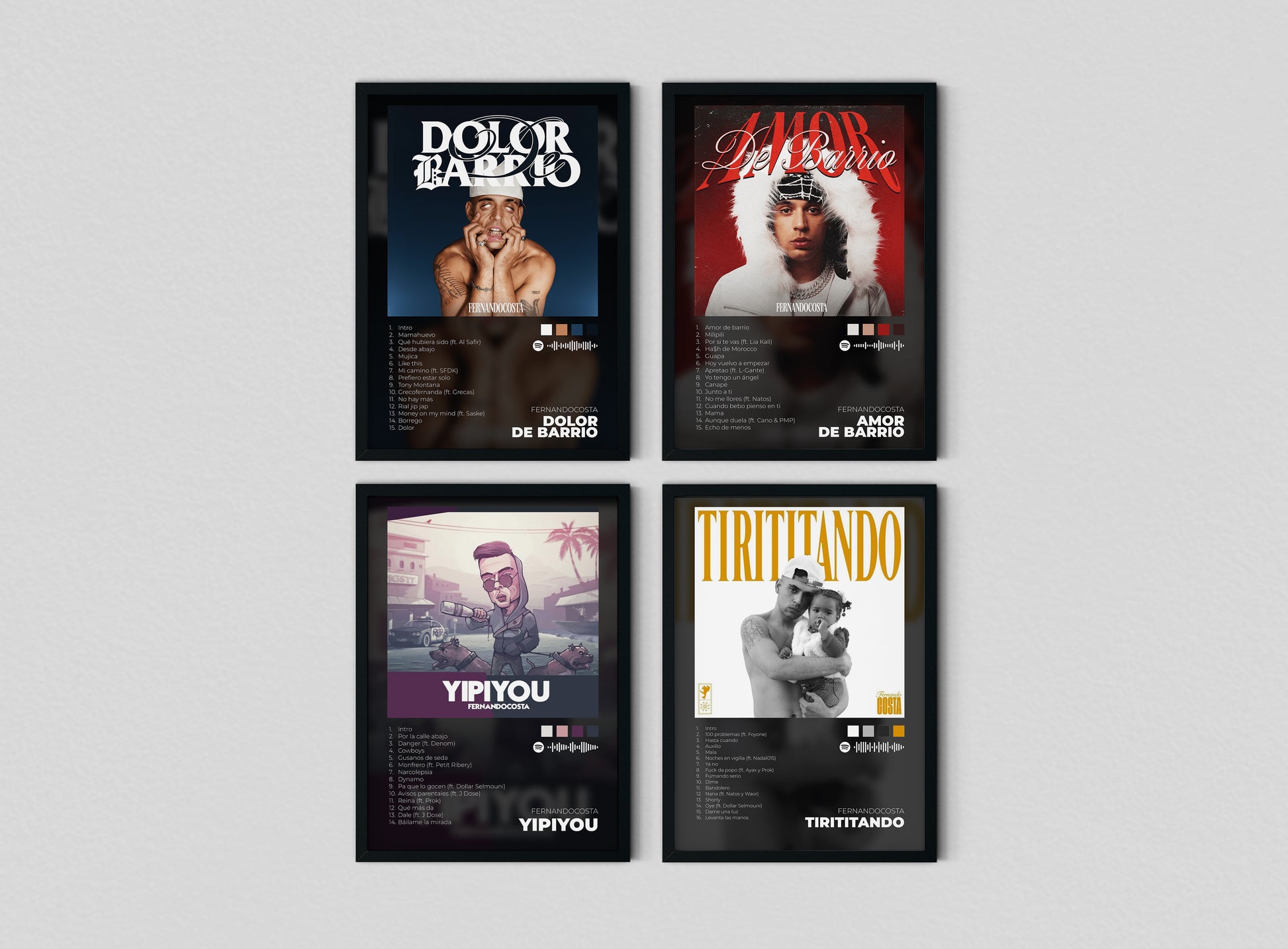 Este pack especial incluye 4 pósters físicos de sus discos más destacados: Amor de Barrio, Dolor de Barrio, Tirititando y Yipiyou, cada uno listo para enmarcar y aportar fuerza y actitud a tu espacio.