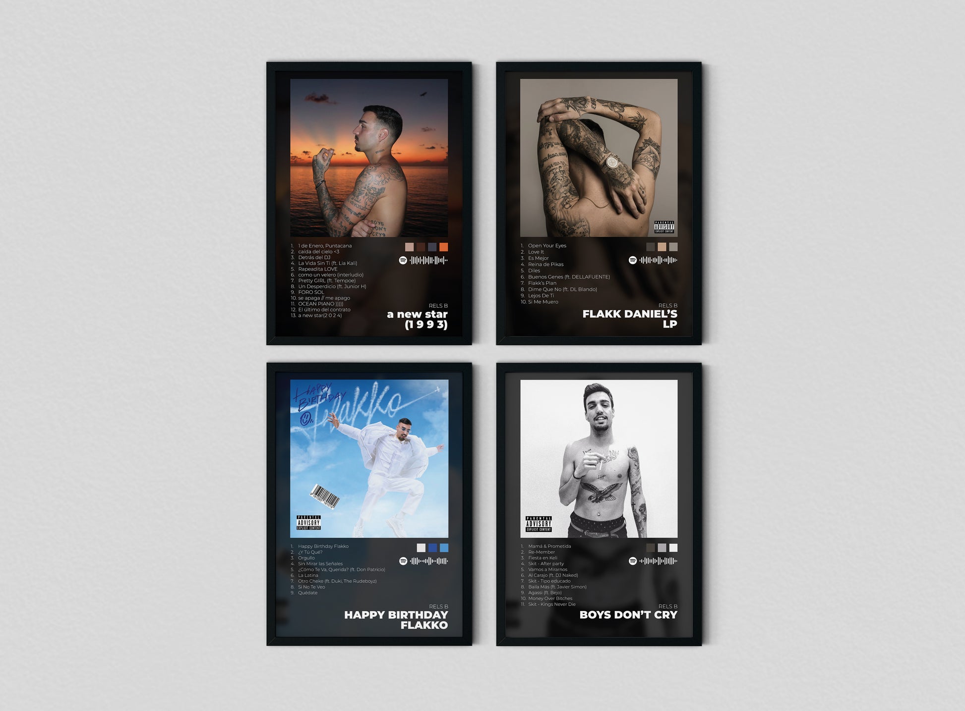 ¡Celebra el Black Friday con lo mejor de Rels B! Este pack exclusivo incluye 4 pósters físicos de sus discos más emblemáticos: A New Star (1 9 9 3), Boys Don’t Cry, Flakk Daniel’s LP y Happy Birthday Flakko, cada uno listo para enmarcar y darle a tu espacio un toque cálido, minimalista y lleno de estilo.